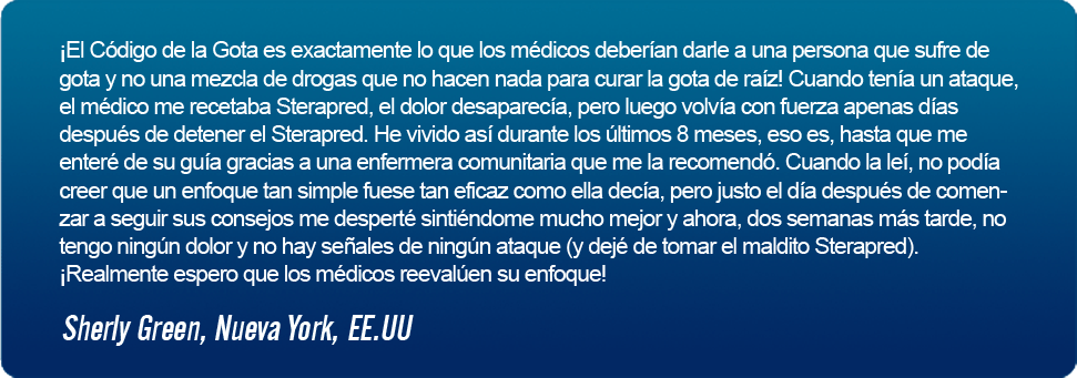 En mi guía paso a paso, “El Código de la Gota™ – Su guía para eliminar el dolor en 7 días o menos – ¡GARANTIZADO!” descubrirá un enfoque preciso para experimentar alivio de la gota a largo plazo.