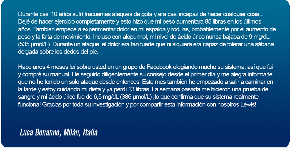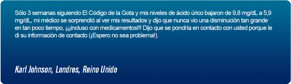 Espero que ahora, usted sepa que hay un camino mejor para resolver sus propios problemas de gota. Incluso mientras mi propia historia se desarrollaba, tengo que decirte que era incrédulo a medida que mis dolores salían de mi cuerpo.
