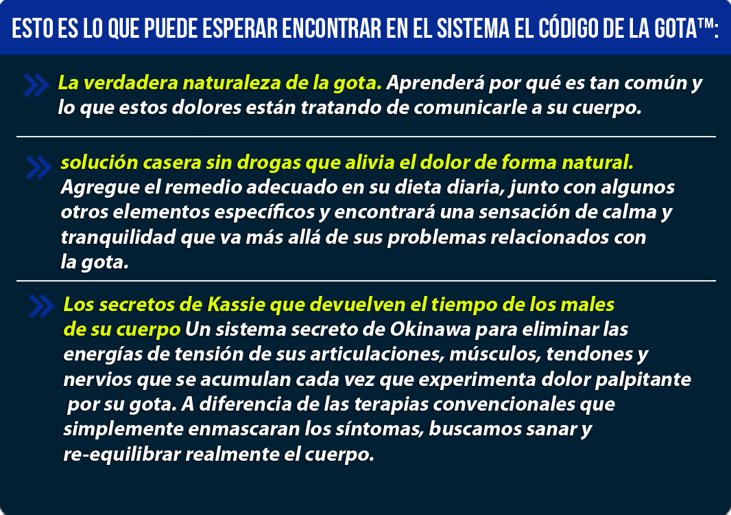 El Código de la Gota™ es la única guía que le mostrará exactamente cómo curar su gota de manera natural y permanente. Puede que se esté preguntando cuanto le va a costar tal sistema que cambia la vida. En primer lugar, déjame preguntarle: ¿Cuánto está dispuesto a pagar para deshacerse de su gota y el dolor constante PARA SIEMPRE?