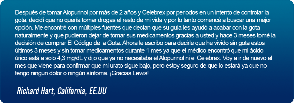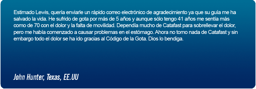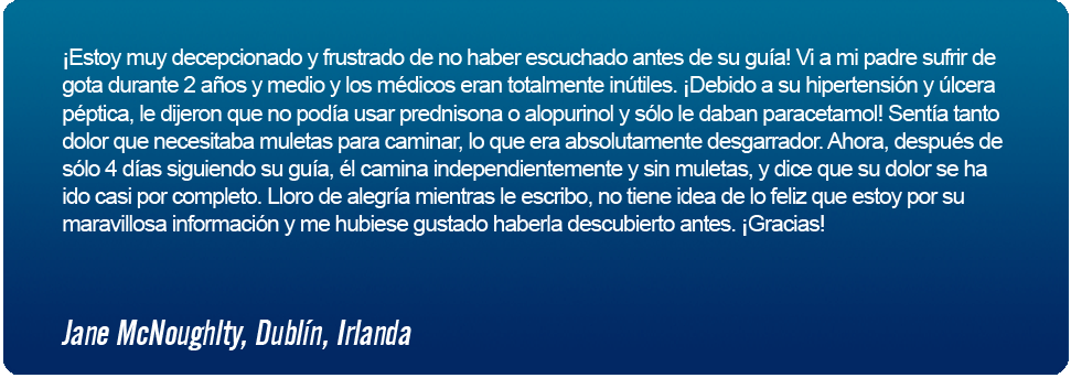 Espero que ahora, usted sepa que hay un camino mejor para resolver sus propios problemas de gota. Incluso mientras mi propia historia se desarrollaba, tengo que decirte que era incrédulo a medida que mis dolores salían de mi cuerpo.